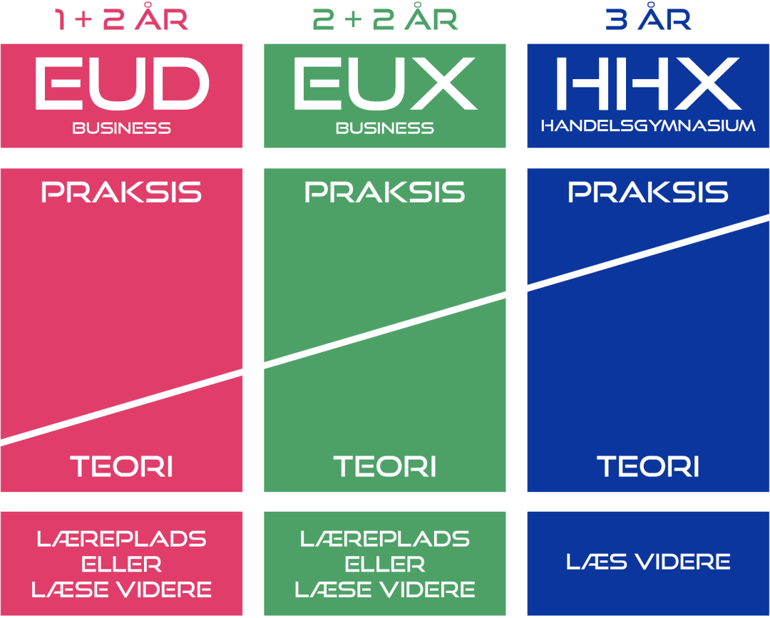 EUX Business kombinerer de to uddannelser, så du både får en teoretisk, men også en lidt mere praktisk uddannelse, der kun tager 2 år, inden du er klar til at læse videre på de mellemlange uddannelser eller komme i lære. Du bliver både erhvervsfaglig student og får en erhvervsuddannelse.