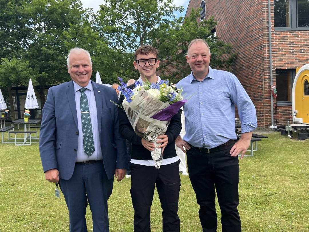 Connor Wilson Kjøller blev årets første handelselev fra EUD Business. Det blev behørigt fejret med direktør Stig Johansen, uddannelseschef Hans Severinsen og den stolte mor i Køge Handelsskoles hyggelige gårdhave.