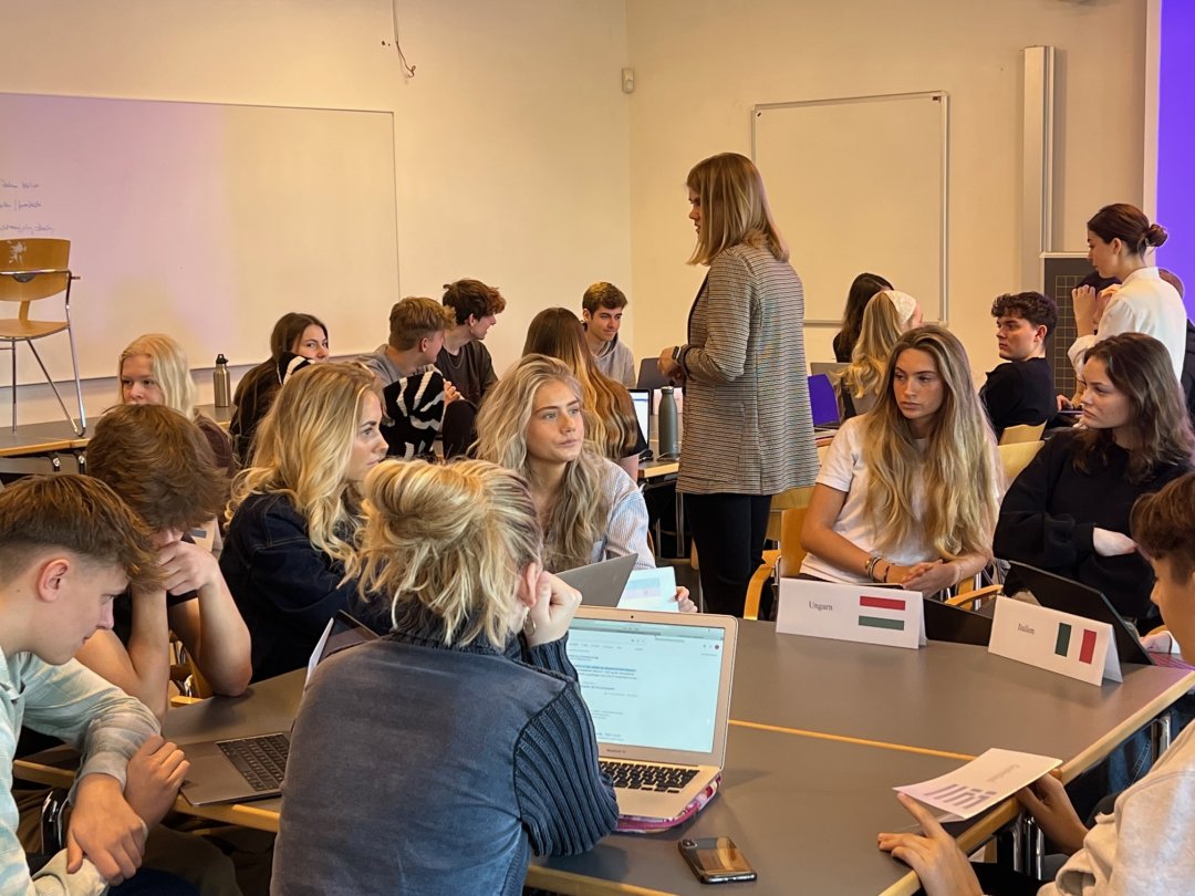 "På denne grønne dag simulerede en række HHX-klasser fra Køge Handelsgymnasium f.eks. COP27 og repræsenterede forskellige lande i debatter og afstemninger - ledet af 4 entusiastiske unge mennesker fra FN Forbundet. Andre klasser var til virksomhedsoplæg ved direktør Henrik Lund fra firmaet Naturli, der levende fortalte om virksomhedens historie, arbejde og produkter. I alle fortsætterfagene var der fokus på klima og bæredygtighed i undervisningen, og skolens Café havde selvfølgelig også kun grøn mad på menuen," fortæller Tina Biil Eriksen, der er international koordinator på Køge Handelsskole.