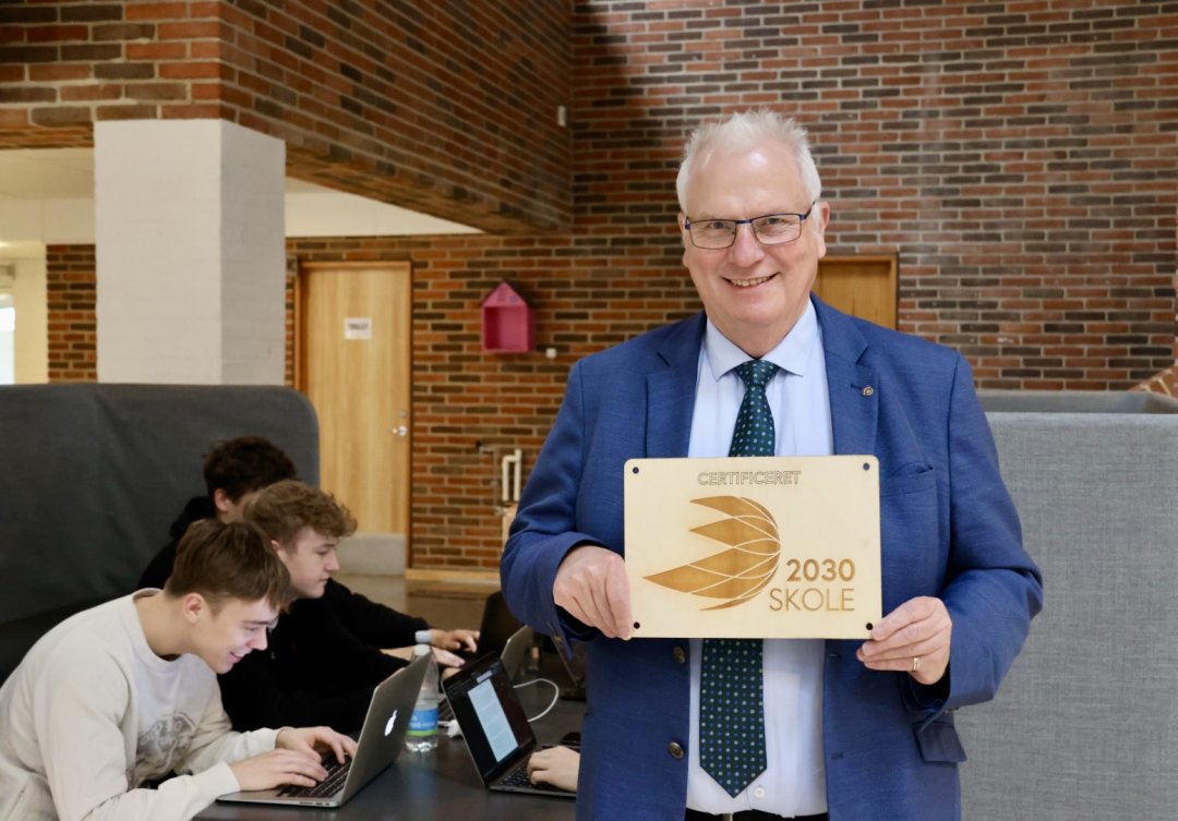 ”Jeg er både glad og stolt over anerkendelsen af vores bæredygtighedsindsats og selvfølgelig også over, at Køge Handelsskole er den første verdensmålscertificeret 2030 SKOLE,” siger Stig Johansen, direktør på Køge Handelsskole.