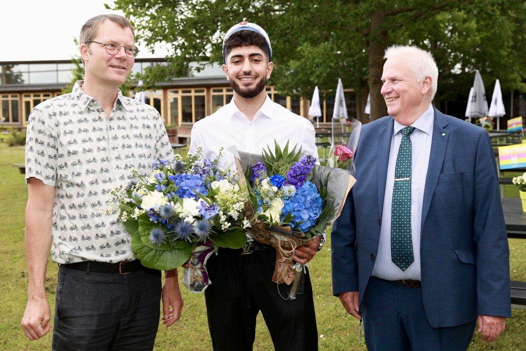 Peshewa Nikolaj Bakhtiar Allan Karim sprang ud som årets første student årgang 2022, da han scorede 12 i International Økonomi til sidste eksamen. Det blev behørigt fejret i Køge Handelsskoles hyggelige gårdhave, hvor direktør Stig Johansen og Uddannelsesrektor Jonas Lindelof ønskede tillykke med blomster, bobler og kransekage.