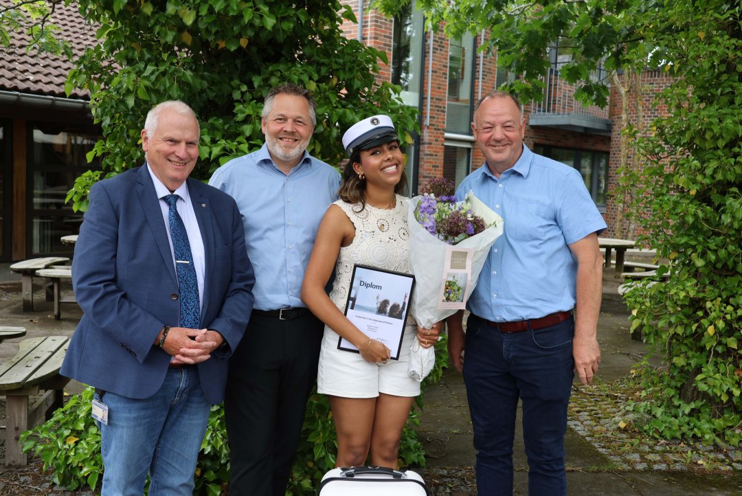 Glæden var derfor til at tage og føle på, da filialdirektør Per Kongstad Slot overrakte legat og kuffert til Frederikka, mens skolens direktør Stig Johansen og uddannelseschef Hans Severinsen stod klar med bobler og blomster.